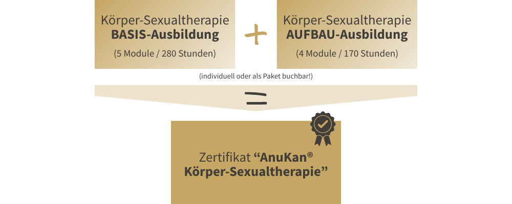 Die gesamte Ausbildung in AnuKan® Körper-Sexualtherapie gliedert sich in 2 Teile; die Basisausbildung und die Aufbauausbildung. Wenn du die Basisausbildung absolviert hast und weitermachen möchtest, wirst du von diesen vier Blöcken nochmals profitieren und kannst das Zertifikat als AnuKan® Körper-Sexualtherapeut/in erwerben.
